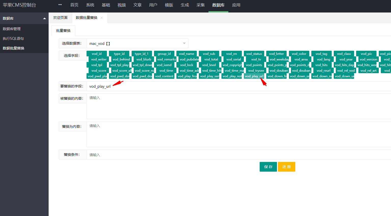2,数据批量替换-选择数据表-拉到最下选择-mac_vod