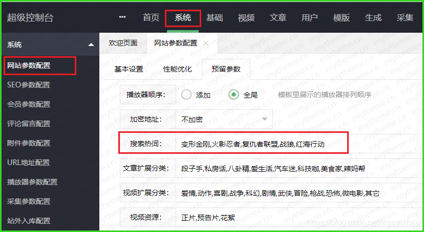 具体操作流程:系统-> 网站参数配置 -> 预留参数 ->搜索热词(用英文逗号分隔)