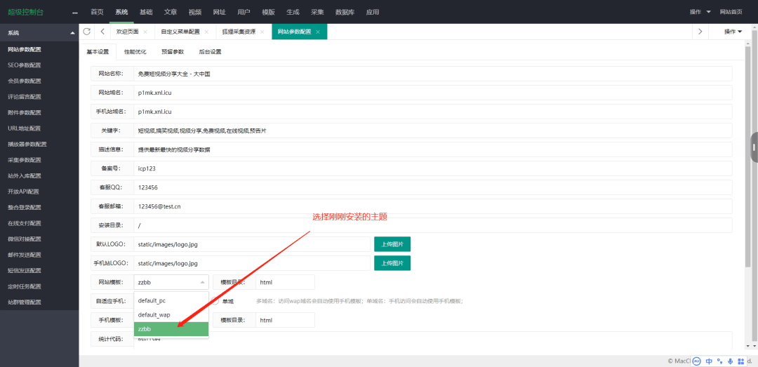 1:找到【网站模板】,选择新上传的这个模板目录名称。例:苹果cms默认pc模板目录名称是 “default_pc”
