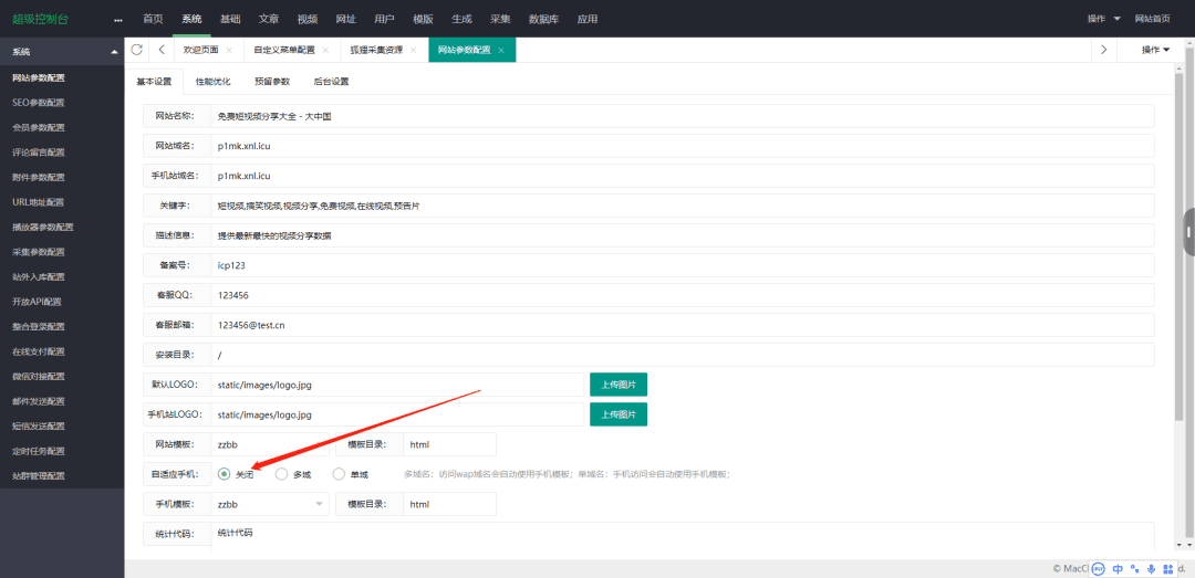 3:如果安装的只是PC端模板,那么也不需要设置【自适应手机】和【手机模板】;【自适应手机】那里关闭即可